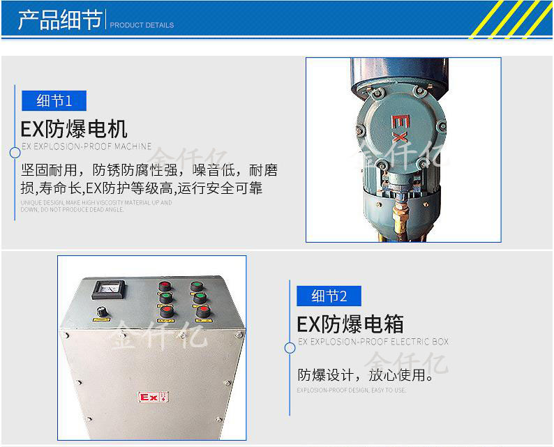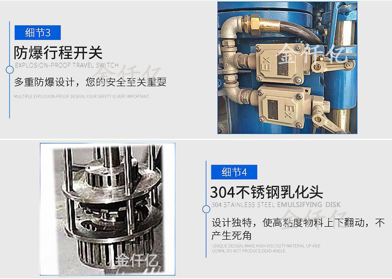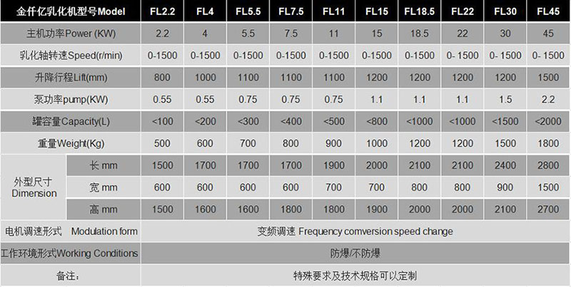 乳化機外觀采用色澤鮮艷,硬度好,耐磨性強的錘紋漆,讓外形更加美觀,更顯檔次;內(nèi)部選高質(zhì)材料,質(zhì)量結(jié)構(gòu)牢固,經(jīng)久耐用;升降系統(tǒng)采用:液壓升降,升降旋轉(zhuǎn)自如,適應各種位置。主軸回轉(zhuǎn)速度有單速、雙速、三速及無級調(diào)速,配置變頻器,對電機實行變頻調(diào)速。電機為品牌防爆電機。